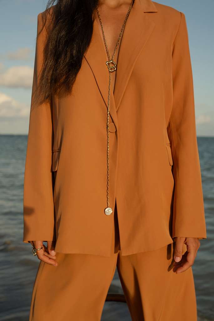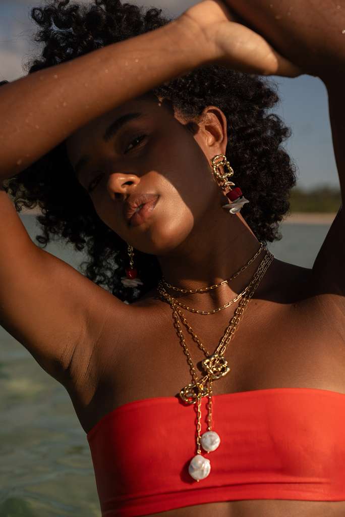 The Coral Marinho Lariat Necklace features a sophisticated gravatinha-style design crafted with a refined gold plated finish and coral-inspired details. Elegant and eye-catching, this necklace brings a modern statement while maintaining a delicate and feminine feel.