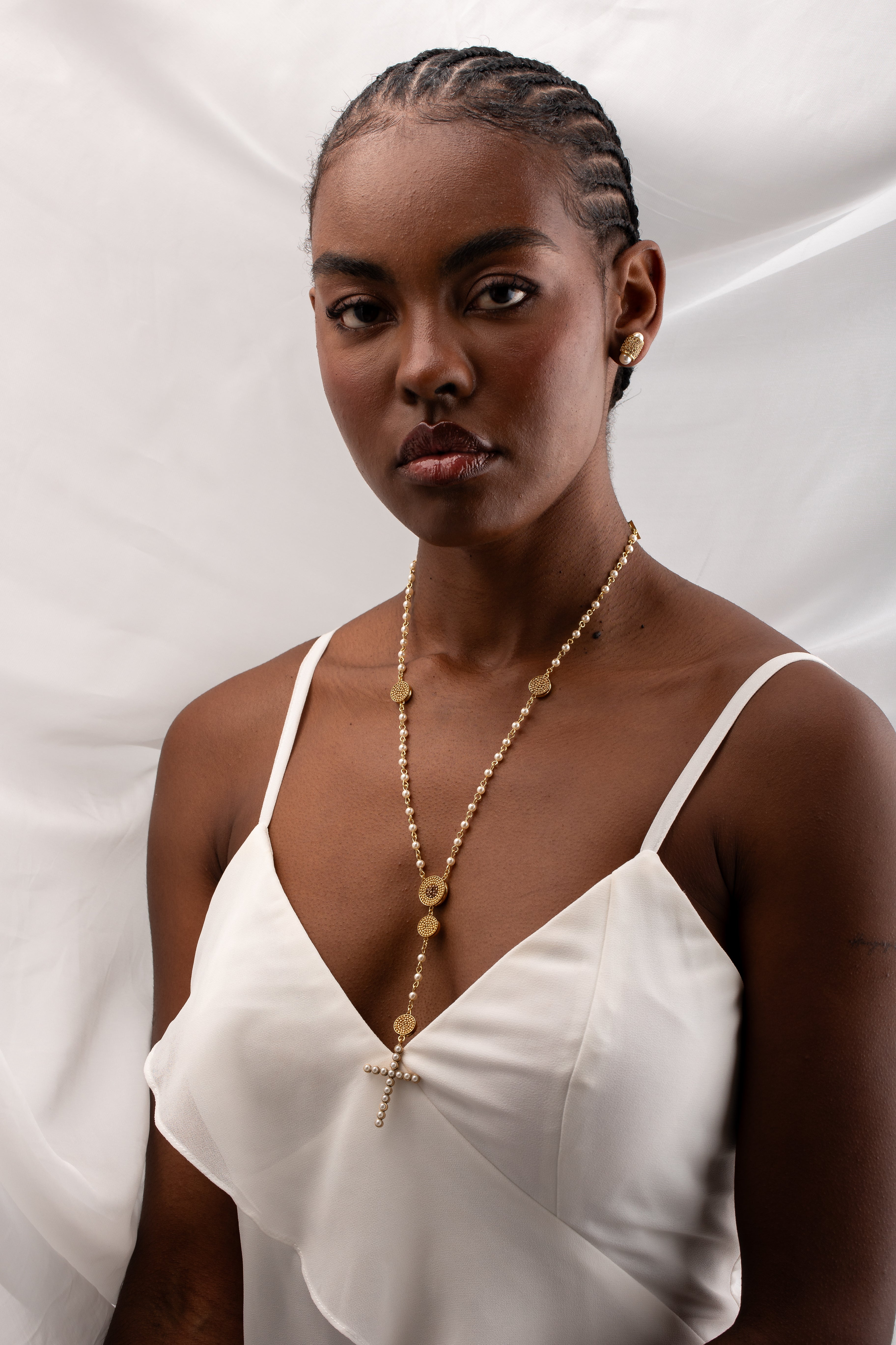 Exclusive necklace crafted from noble metal with refined 18K gold plating. Features a handcrafted rosary detail combining lustrous pearls and sparkling crystals, finished with Italian varnish for unmatched durability and lasting shine. Finished with the LR Nickel Free seal to minimize allergic reactions, this piece offers elegant comfort and artisanal refinement in every detail.