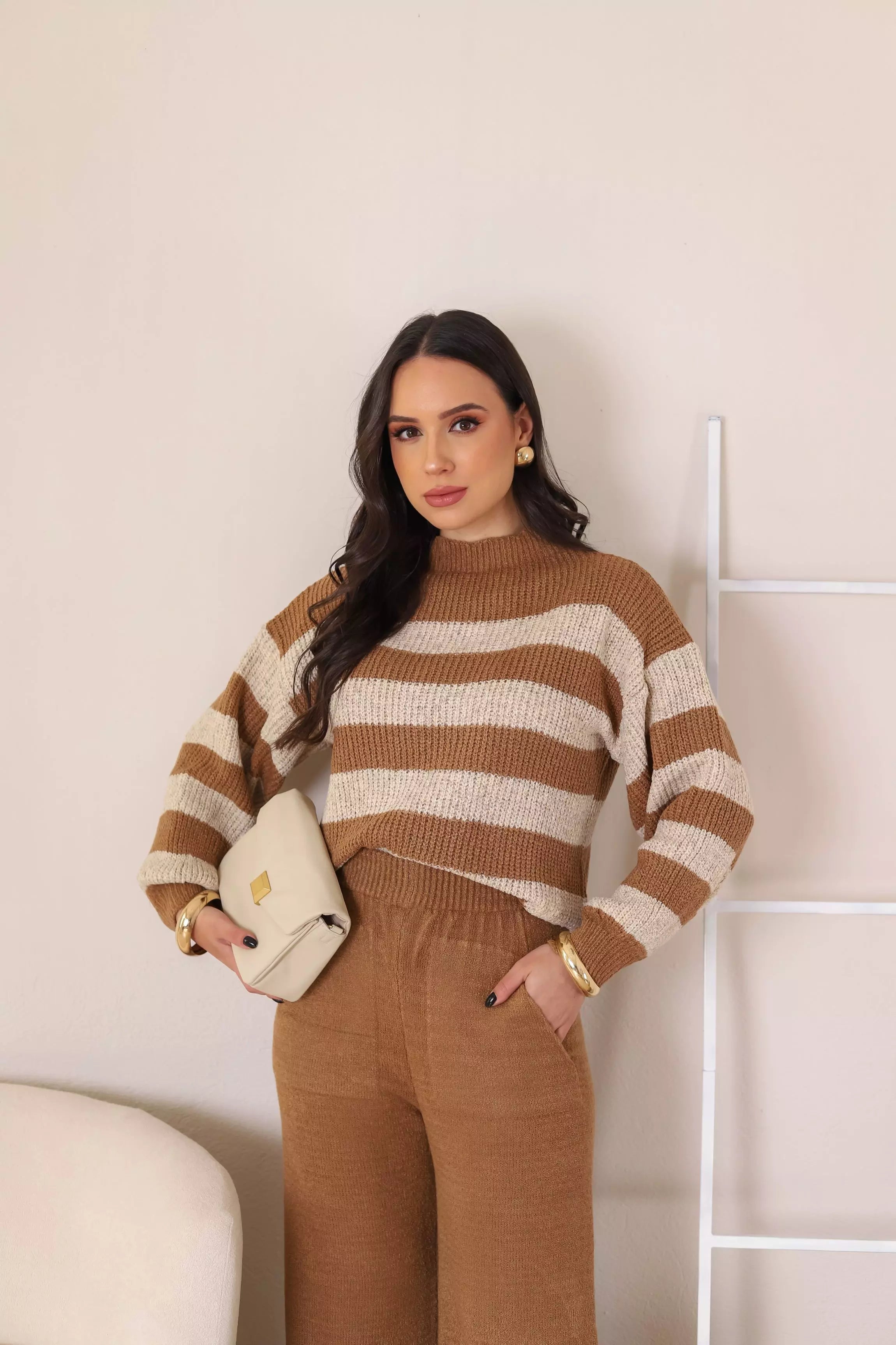 Elevate your style with our luxurious Knit Set, crafted from premium Mussi yarn. This set includes a stylish striped sweater and trendy wide leg pants, offering both comfort and chic appeal. Perfect for effortlessly sophisticated looks.