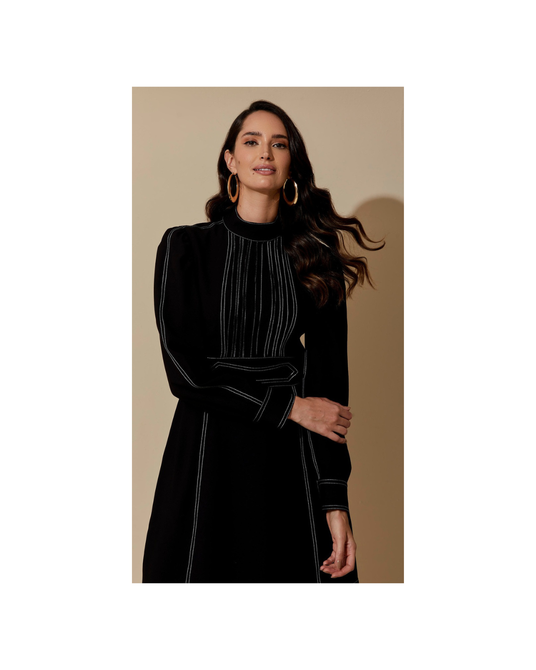 Sophisticated and timeless, this Brazilian black dress is made from soft twill viscose, offering a smooth touch and elegant structure. Featuring contrasting white topstitch details, it adds a refined and modern touch to a classic silhouette. The short sleeves and midi length make it perfect for both work and special occasions.
