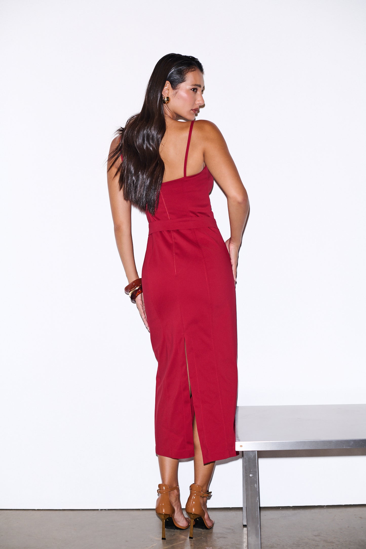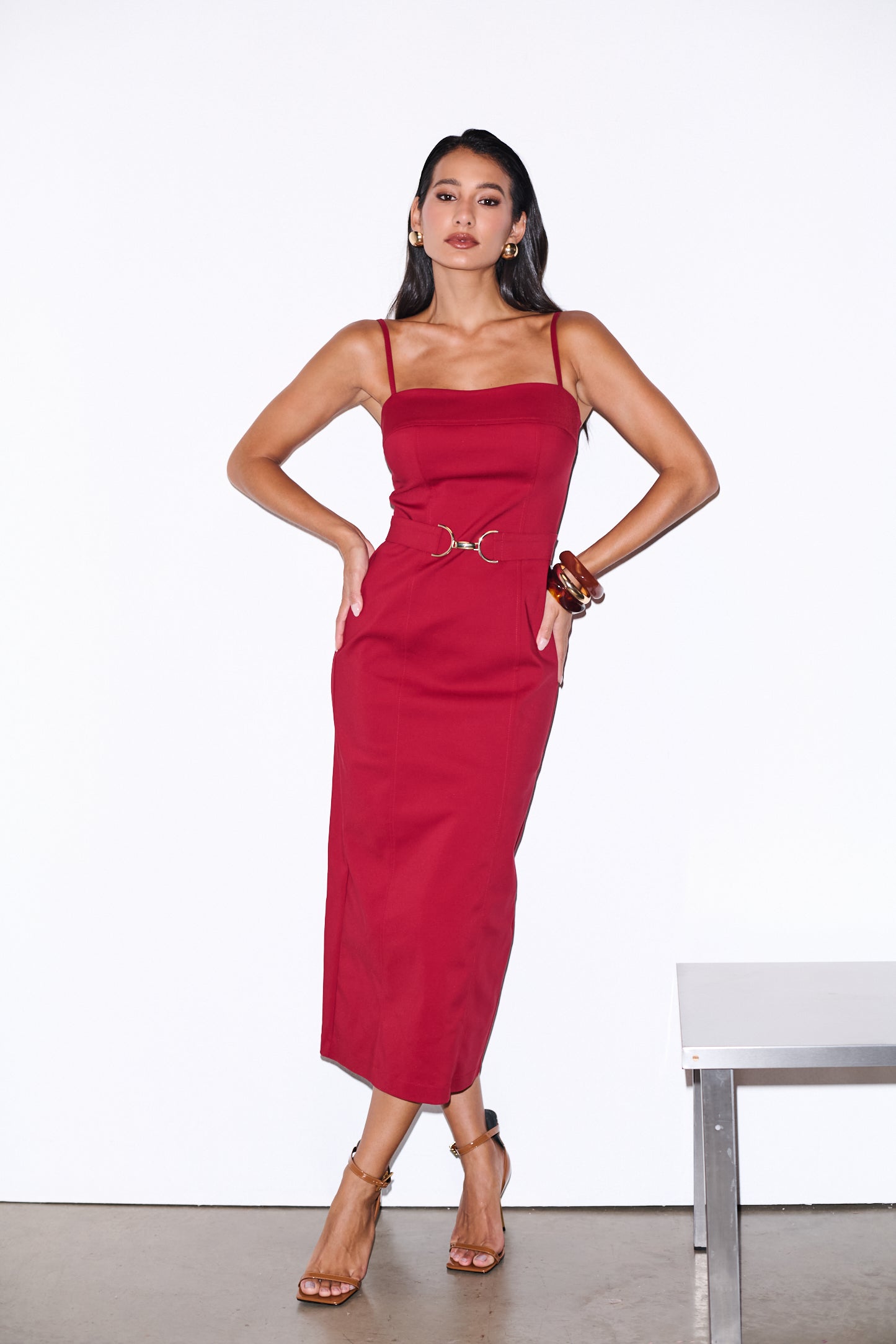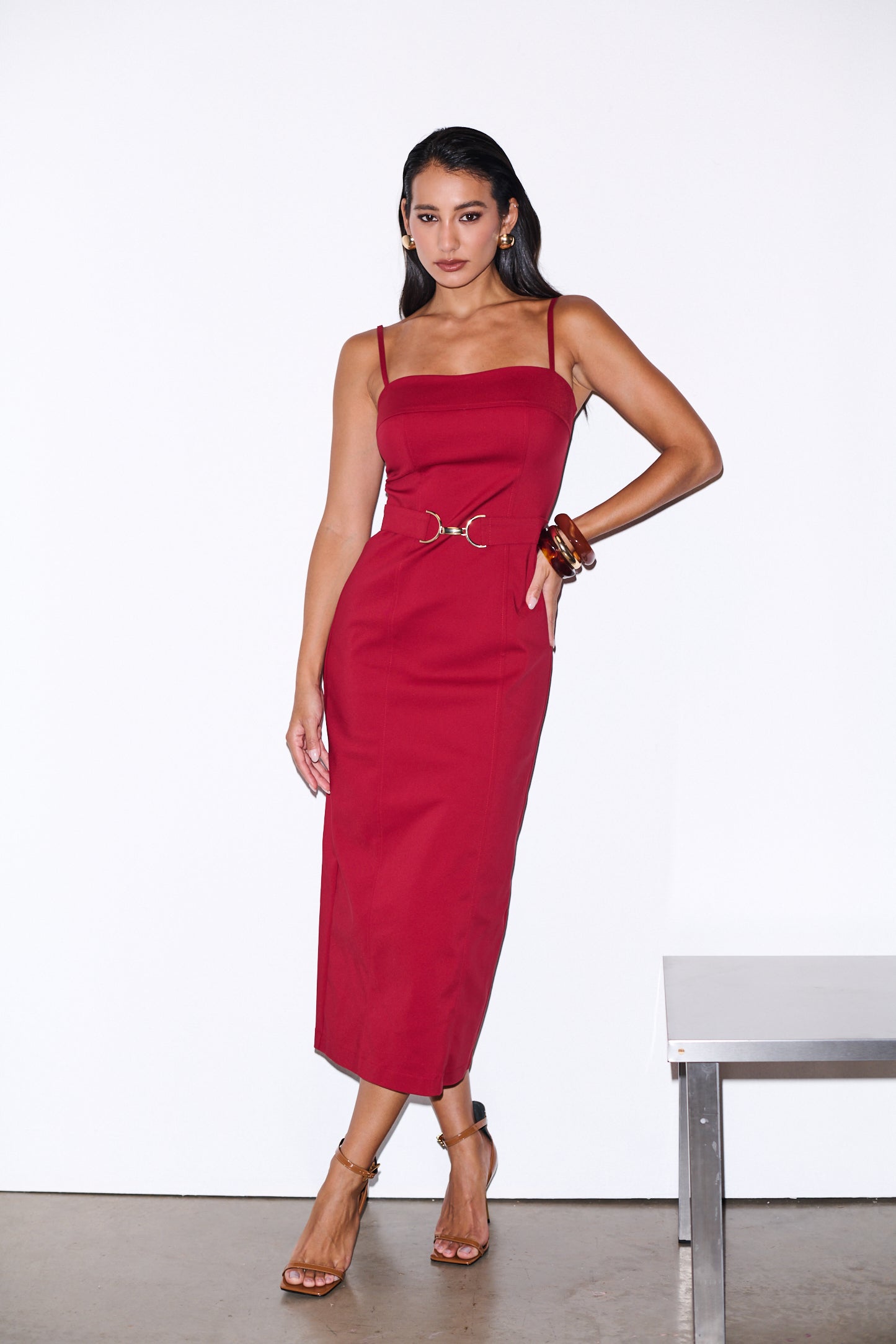 Turn heads with this Brazilian red midi dress, a timeless piece that combines elegance and allure. Designed with thin straps and a waist belt featuring a chic buckle, it enhances the silhouette with a refined fit. The back slit adds a subtle touch of sensuality and ease of movement, making it perfect for both daytime sophistication and evening occasions.