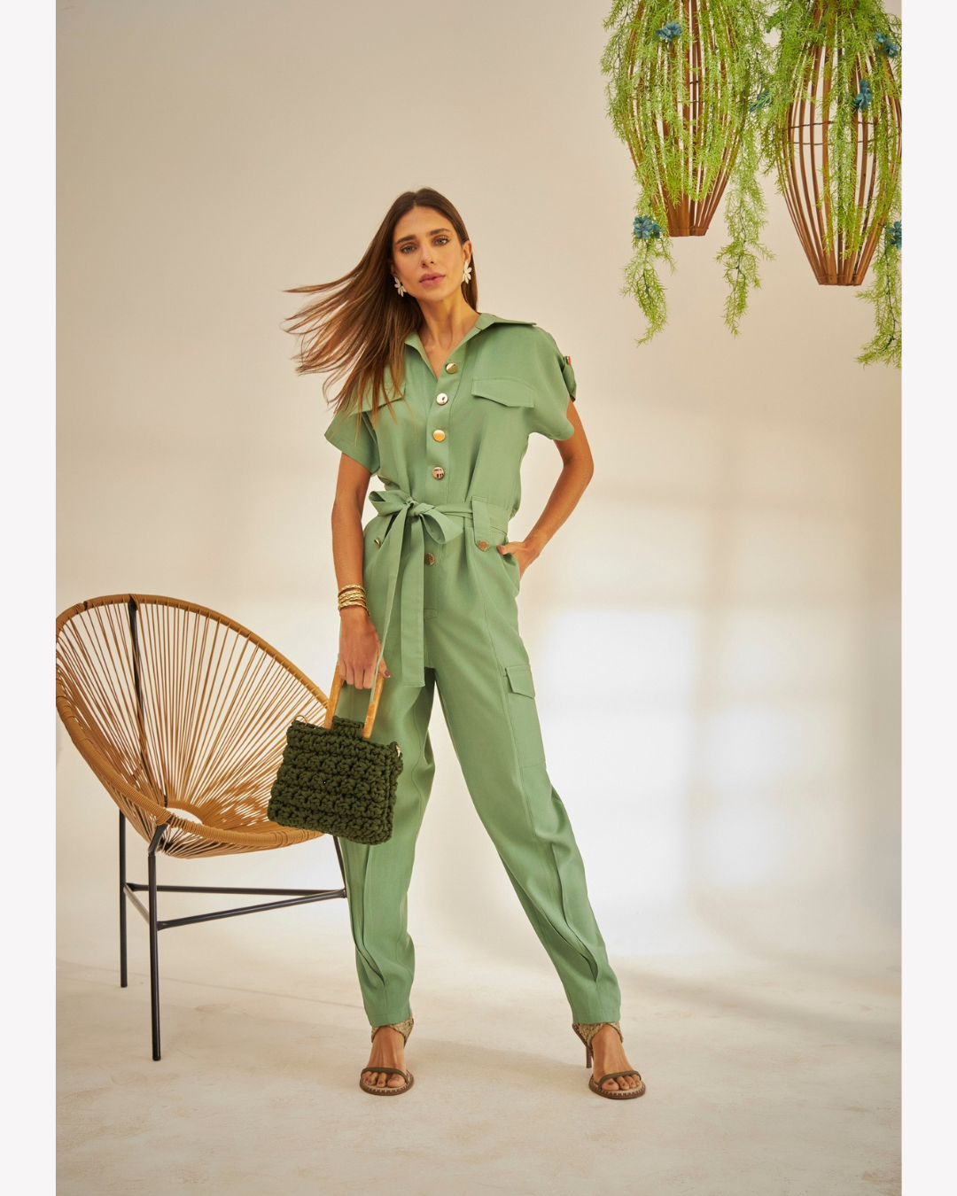 Elegant and effortless, this Brazilian jumpsuit is crafted from soft viscose twill, offering a fluid drape and a refined finish. Designed with front button closure and a matching fabric tie belt, it enhances the silhouette while ensuring comfort and sophistication. Perfect for both daytime elegance and evening charm.
