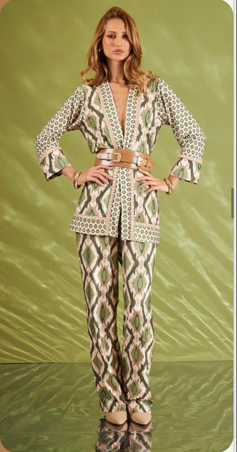 The flowy kimono pairs beautifully with the straight-leg pants, creating a timeless silhouette that transitions effortlessly from day to night. Made in Brazil with premium-quality fabric, this set embodies the essence of effortless luxury — perfect for women who love unique prints, modern design, and elegant comfort.