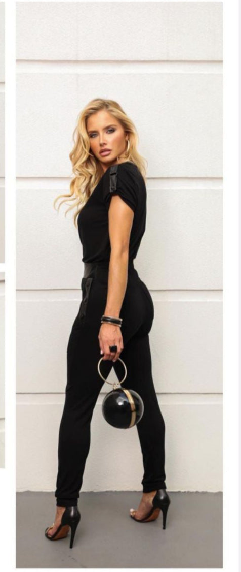 A modern set crafted in viscose with elastane, designed to combine comfort and style. The short-sleeve top pairs perfectly with the jogger-cut pants, creating an effortless yet chic silhouette. Vegan leather details add a touch of sophistication, making this set ideal for both casual and urban looks.