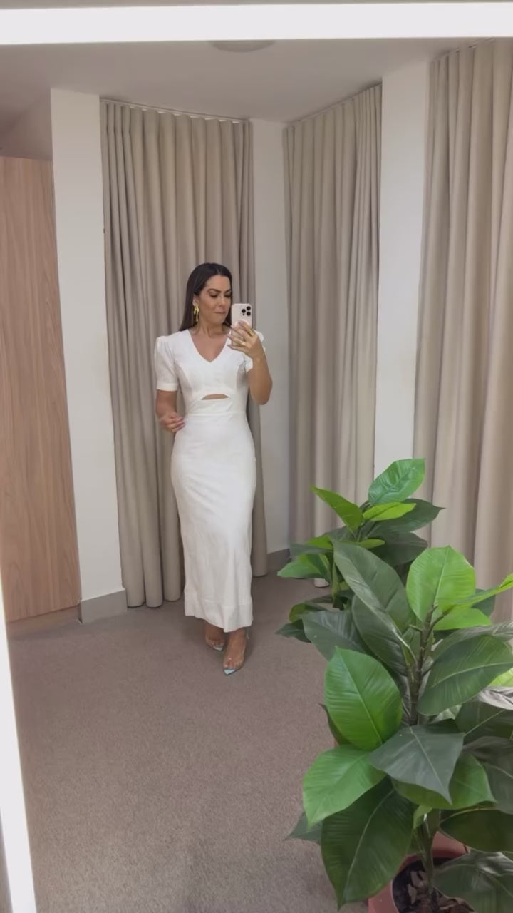 Discover timeless beauty with this beautiful and delicate white laise dress. Featuring a sophisticated front cut-out and short sleeves, this dress embodies elegance and charm.