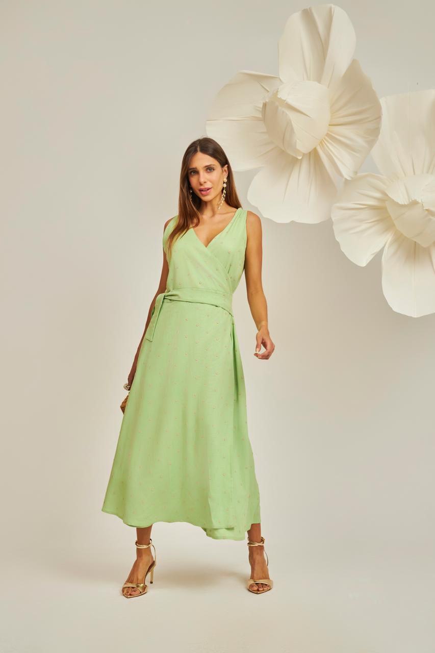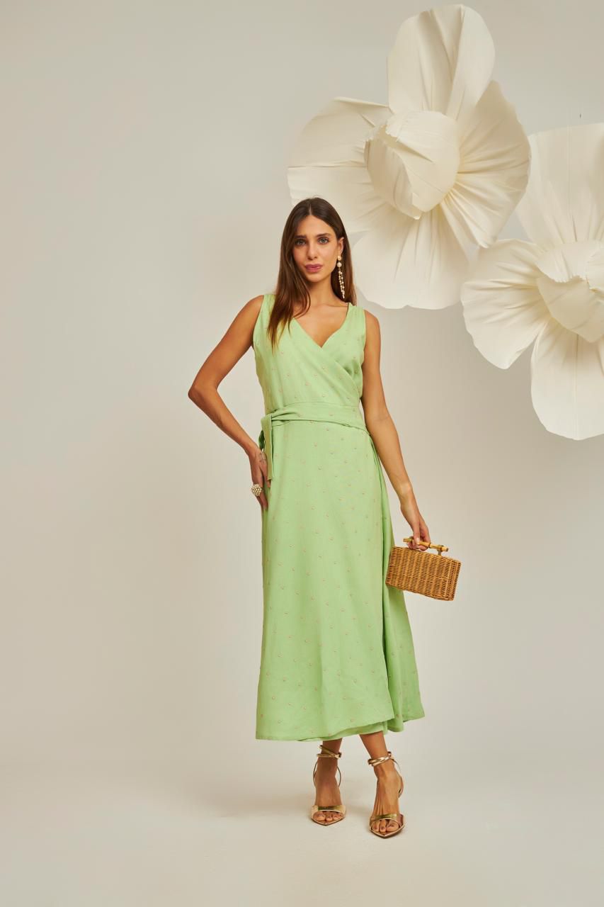 Discover the perfect midi viscose-linen dress featuring delicate polka dot embroidery for a refined, feminine look. The wrap cut flatters the silhouette and offers an adjustable, comfortable fit, while the full lining ensures smooth drape and all-day comfort. Lightweight and breathable, this midi dress with lining is ideal for casual outings, daytime events, and effortless chic styling.