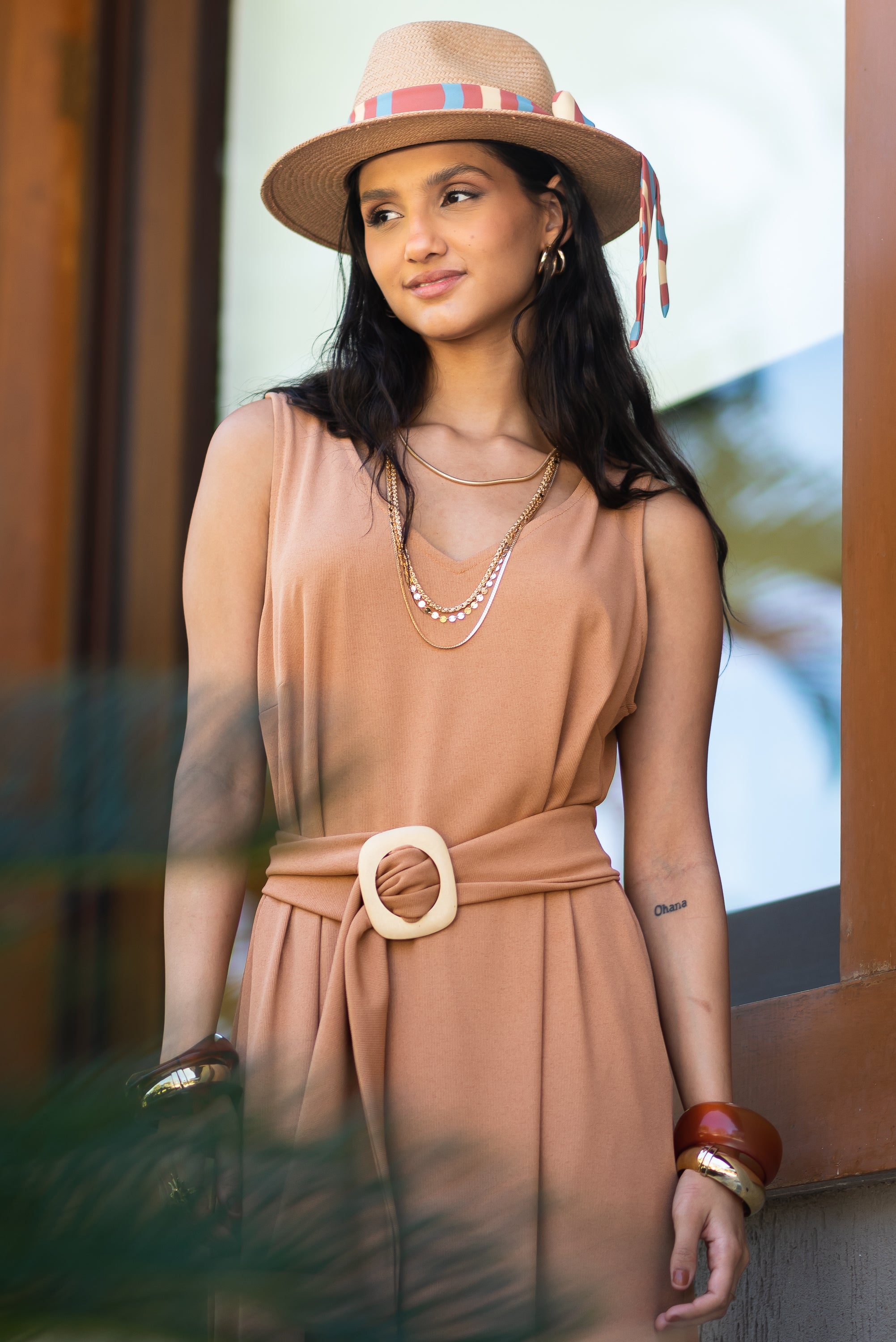 Featuring refined side slits, the design adds movement and a subtle touch of sensuality while maintaining a polished and elegant look. The dress comes with a statement belt featuring a natural wooden buckle, creating a distinctive and contemporary finish that highlights the waist beautifully.