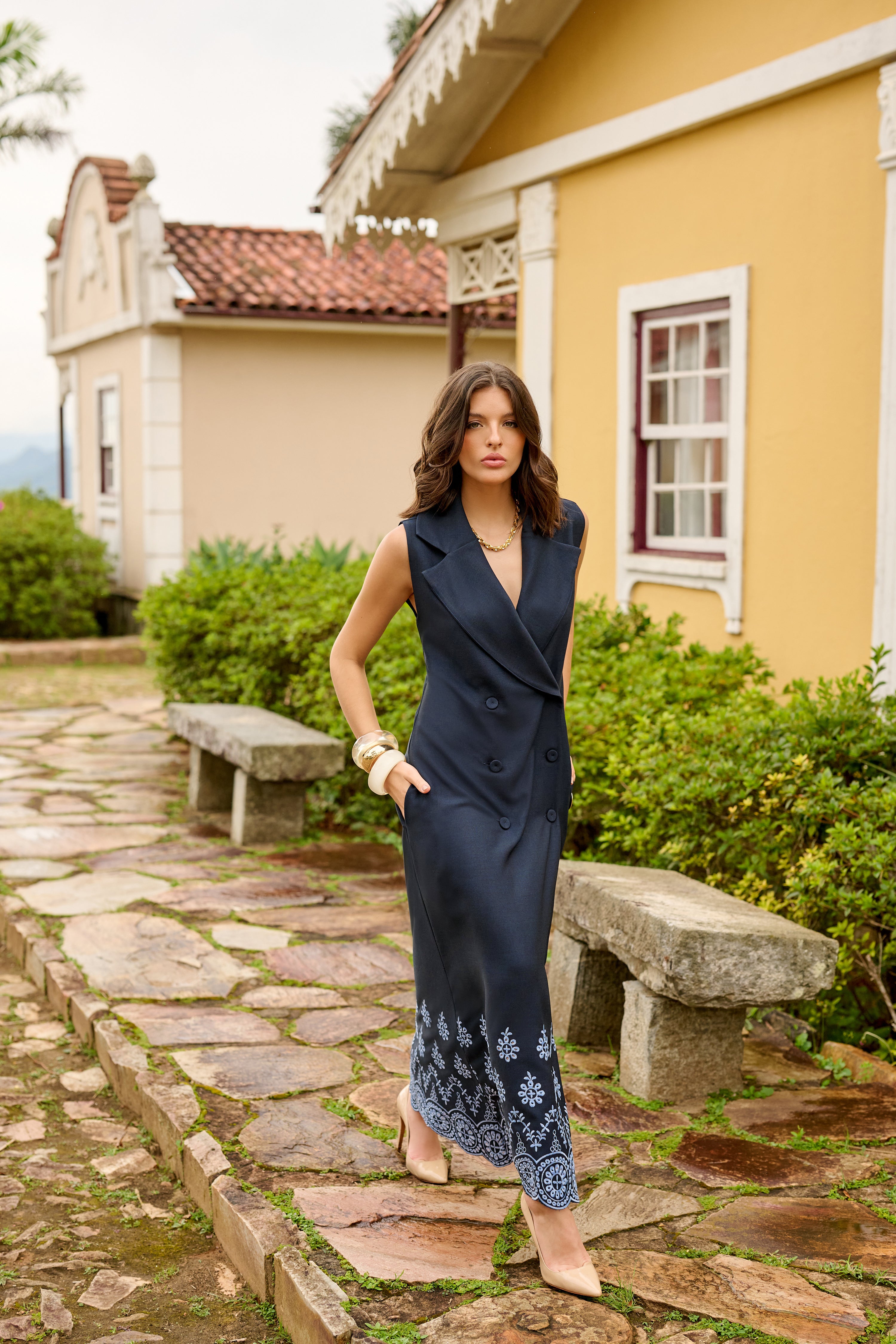 Blazer-style dress with a tailored fit, front button closure, and a fully embroidered hemline. This chic embroidered blazer dress combines classic tailoring with modern elegance, making it the perfect choice for parties, evening events, or special occasions. Its structured design and lined finish ensure comfort and sophistication in every detail.