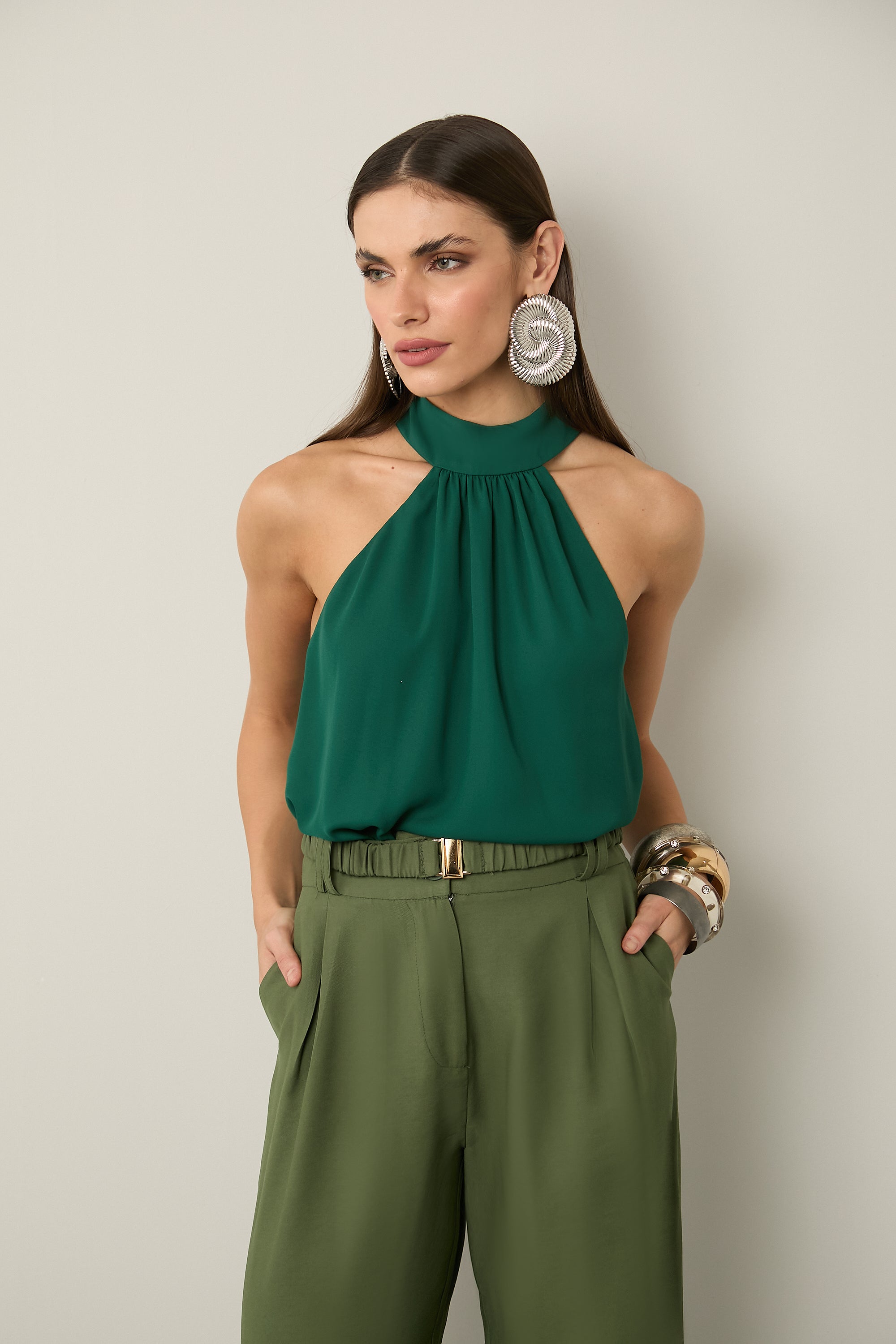 Refined and elegant, the Brazilian High-Neck Chiffon Blouse comes in a striking flag green shade and features a fully lined design for added structure and comfort. Made from airy chiffon with an impeccable finish, this piece is perfect for polished looks that transition seamlessly from day to night.