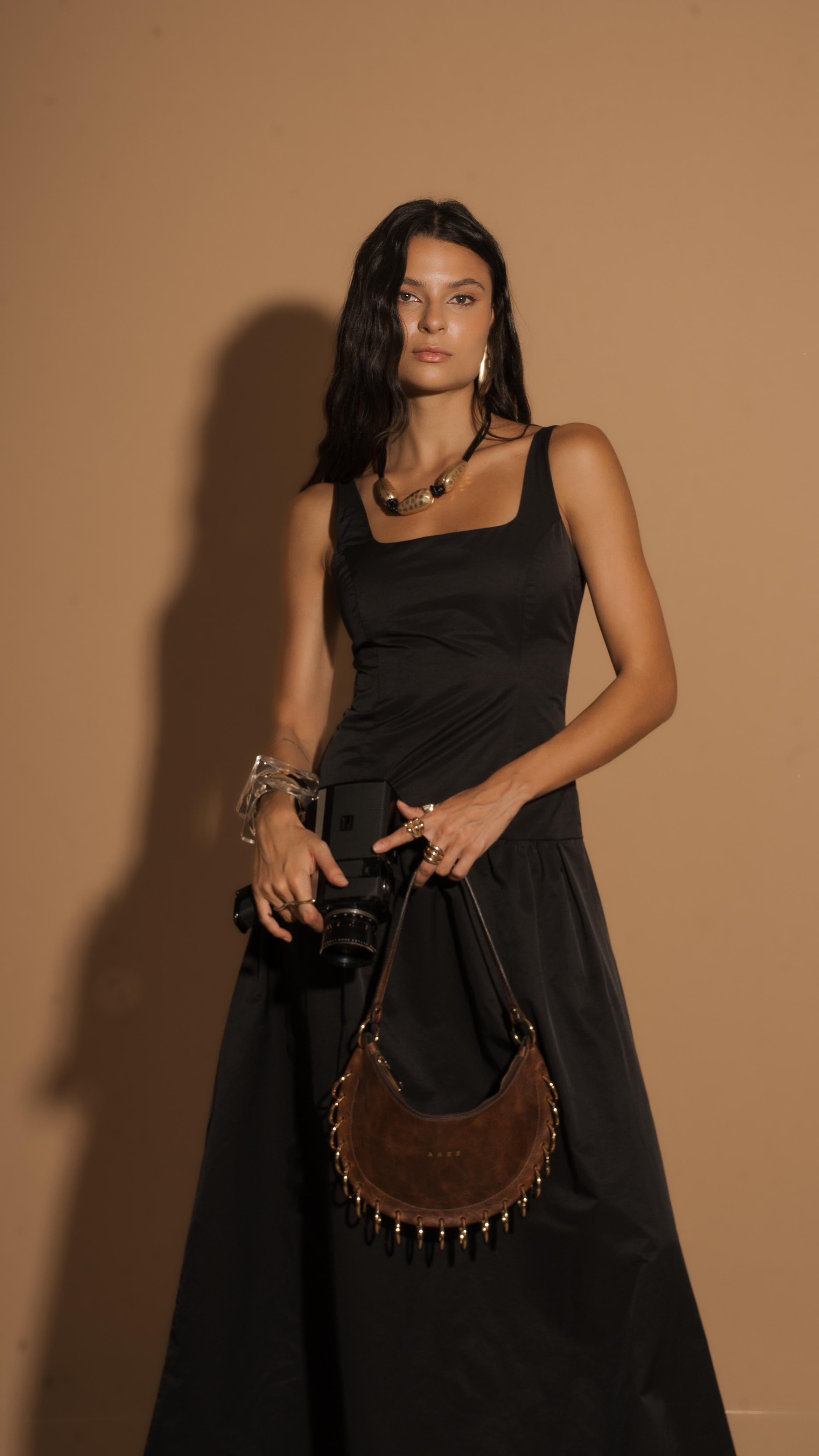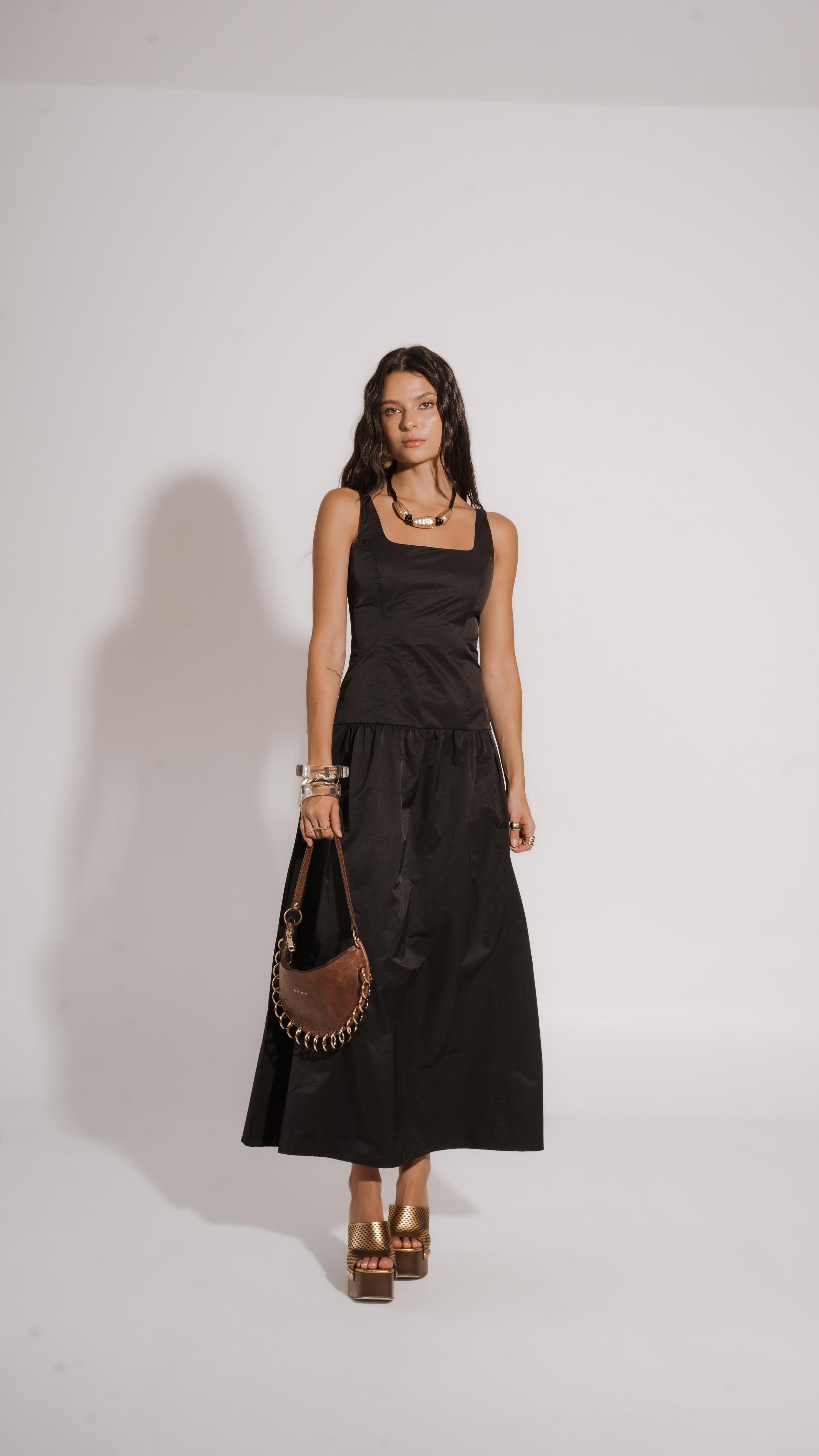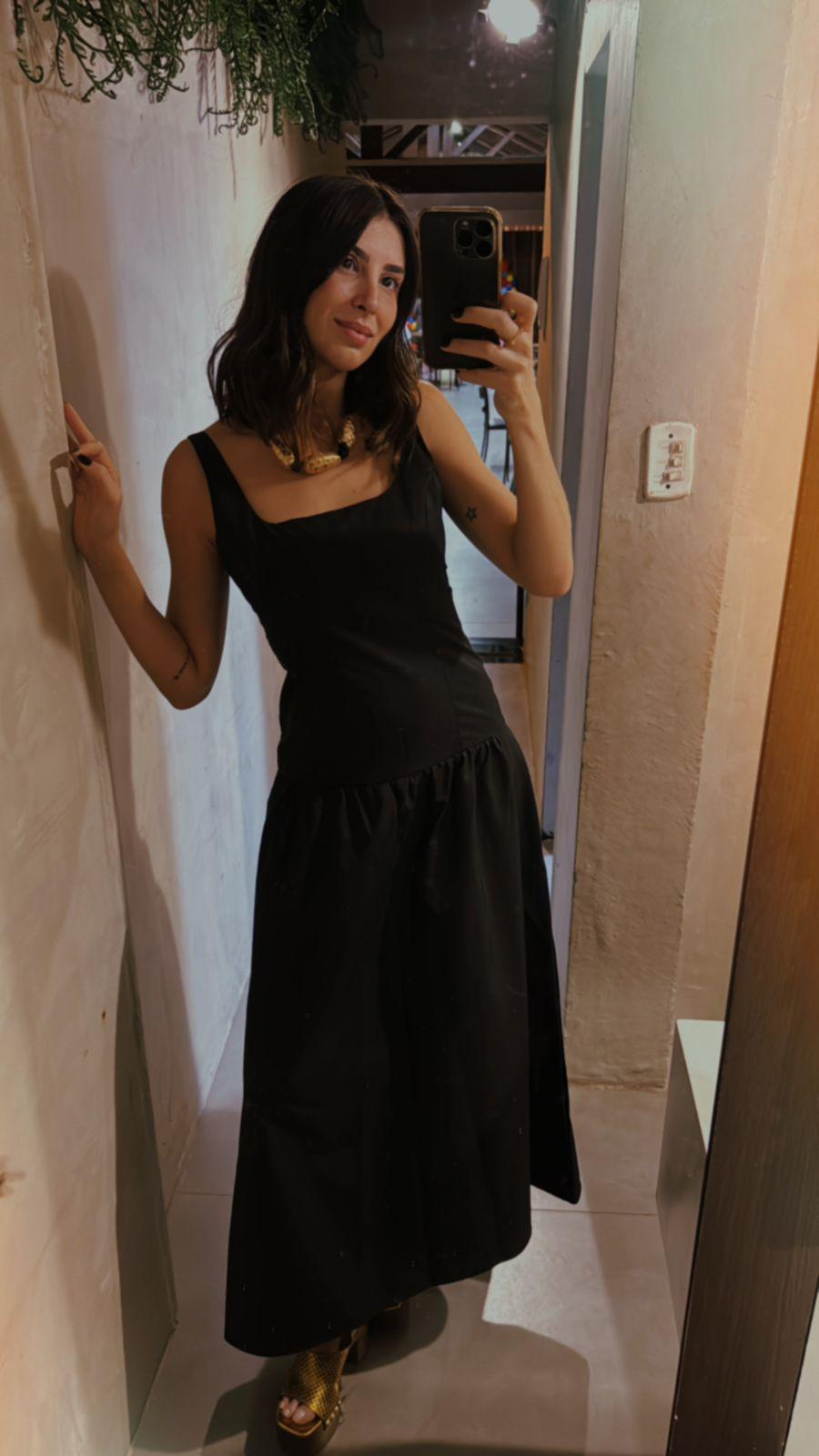 The Brazilian midi dress is a timeless essential, designed in a classic fitted cut that enhances the waistline with elegance. Crafted from double umbrella fabric, it offers impeccable structure, durability, and a flawless drape. Fully doubled, this dress combines sophistication and comfort, making it perfect for both day and evening occasions.