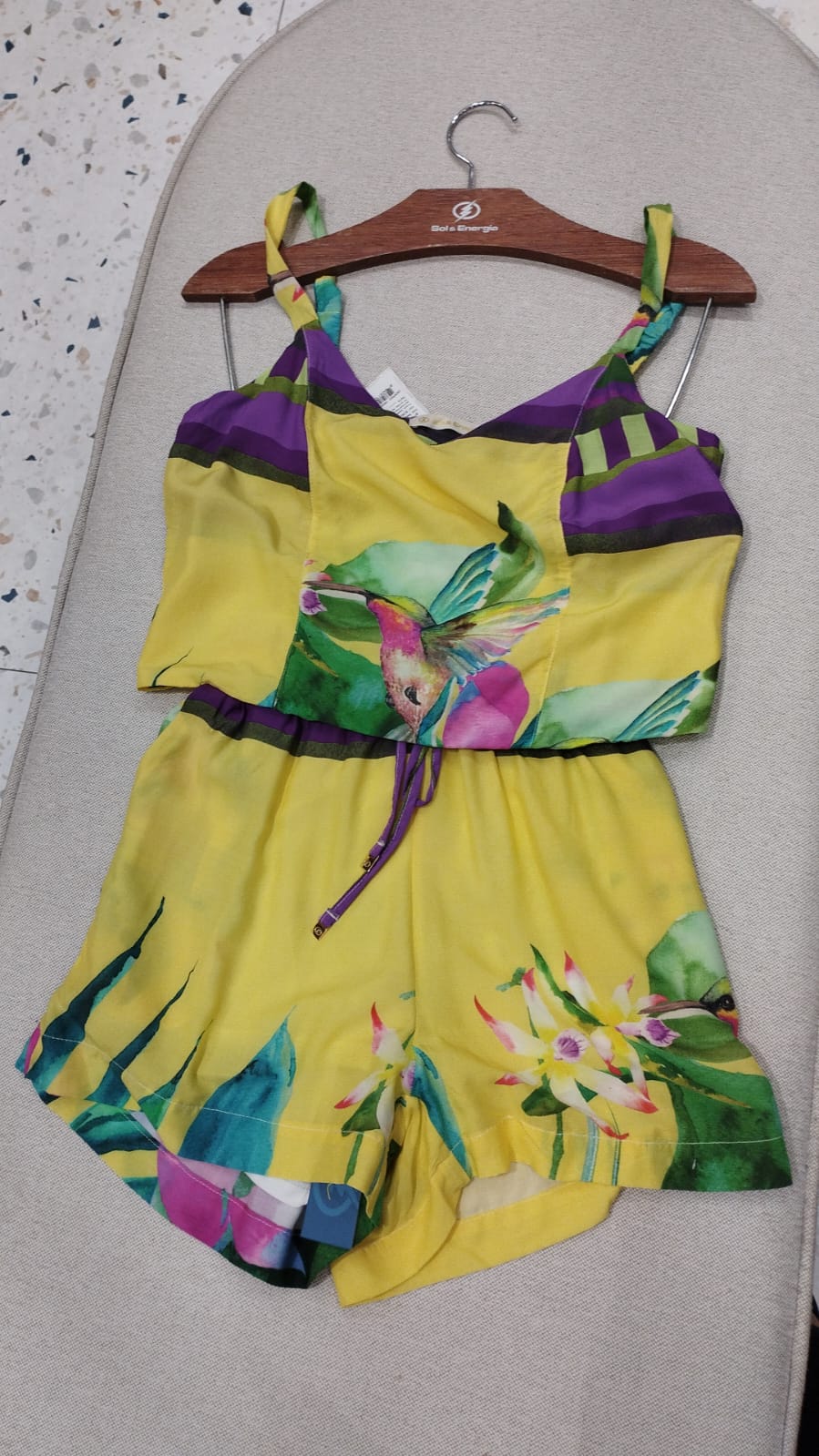 This charming Brazilian set features a tank top and shorts made from 100% viscose, now in a beautiful bird print. The fabric is soft and breathable, ideal for sunny days. The shorts come fully lined for comfort and coverage, offering a stylish and fresh look with a tropical flair.