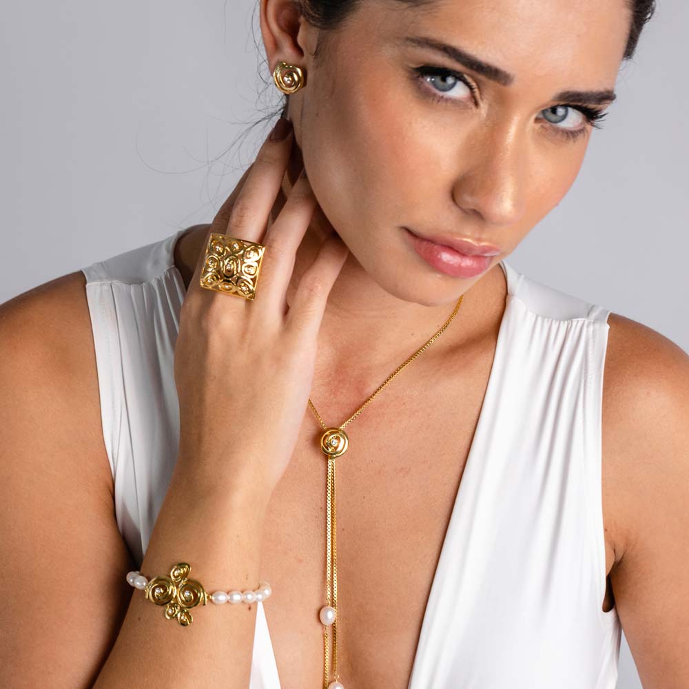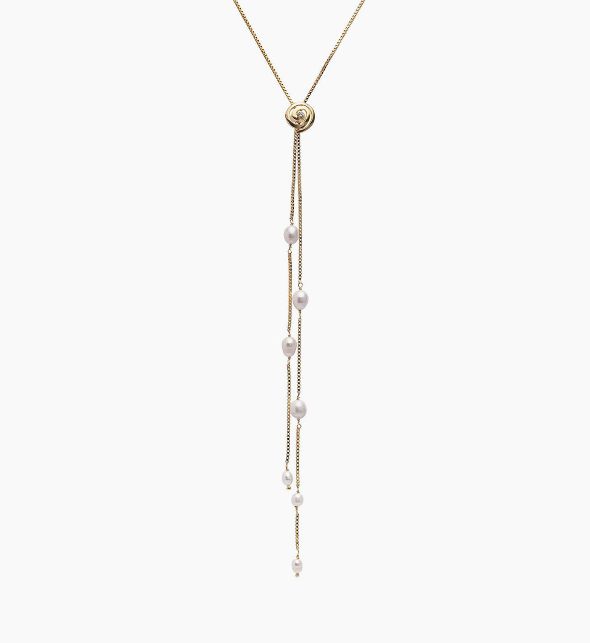 This Brazilian lariat-style necklace features an exclusive design in noble metal with refined 18k gold plating, sparkling transparent Czech crystals, and a natural freshwater pearl. Finished with Italian lacquer for exceptional shine and long-lasting durability. Adjustable and designed with the LR Nickel-Free seal to reduce allergies while offering elegance and comfort.