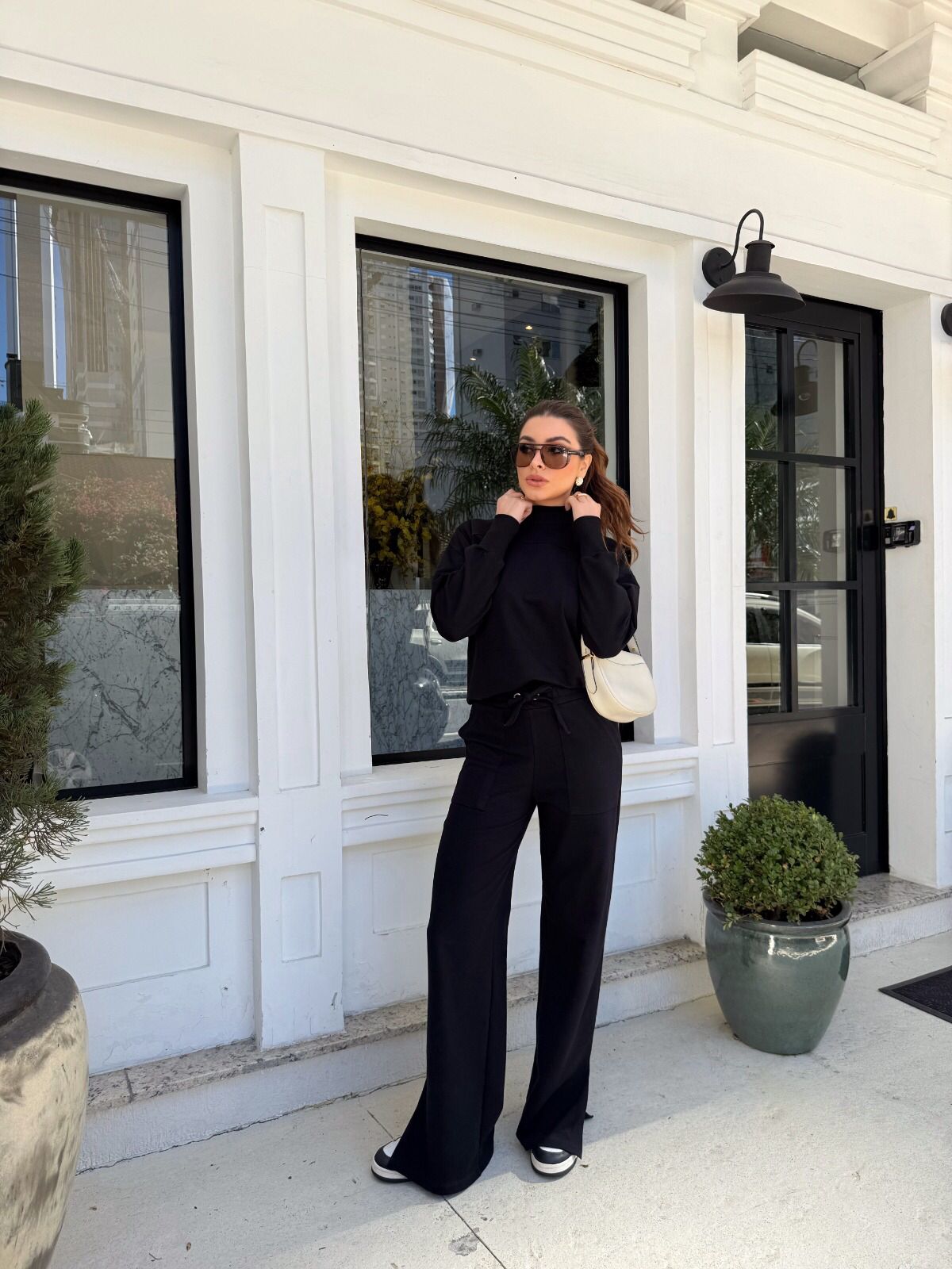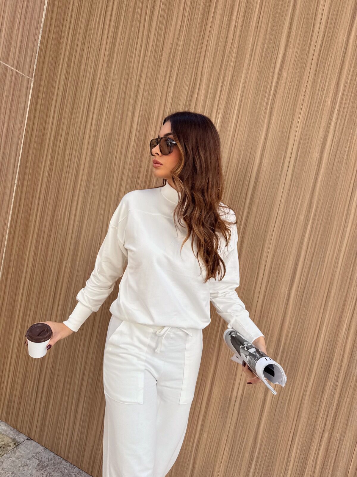 A modern take on loungewear, this set is crafted in soft sweatshirt fabric with added elastane for extra comfort. The wide-leg pants feature side pockets and a sleek front crease, combining casual ease with a touch of sophistication.