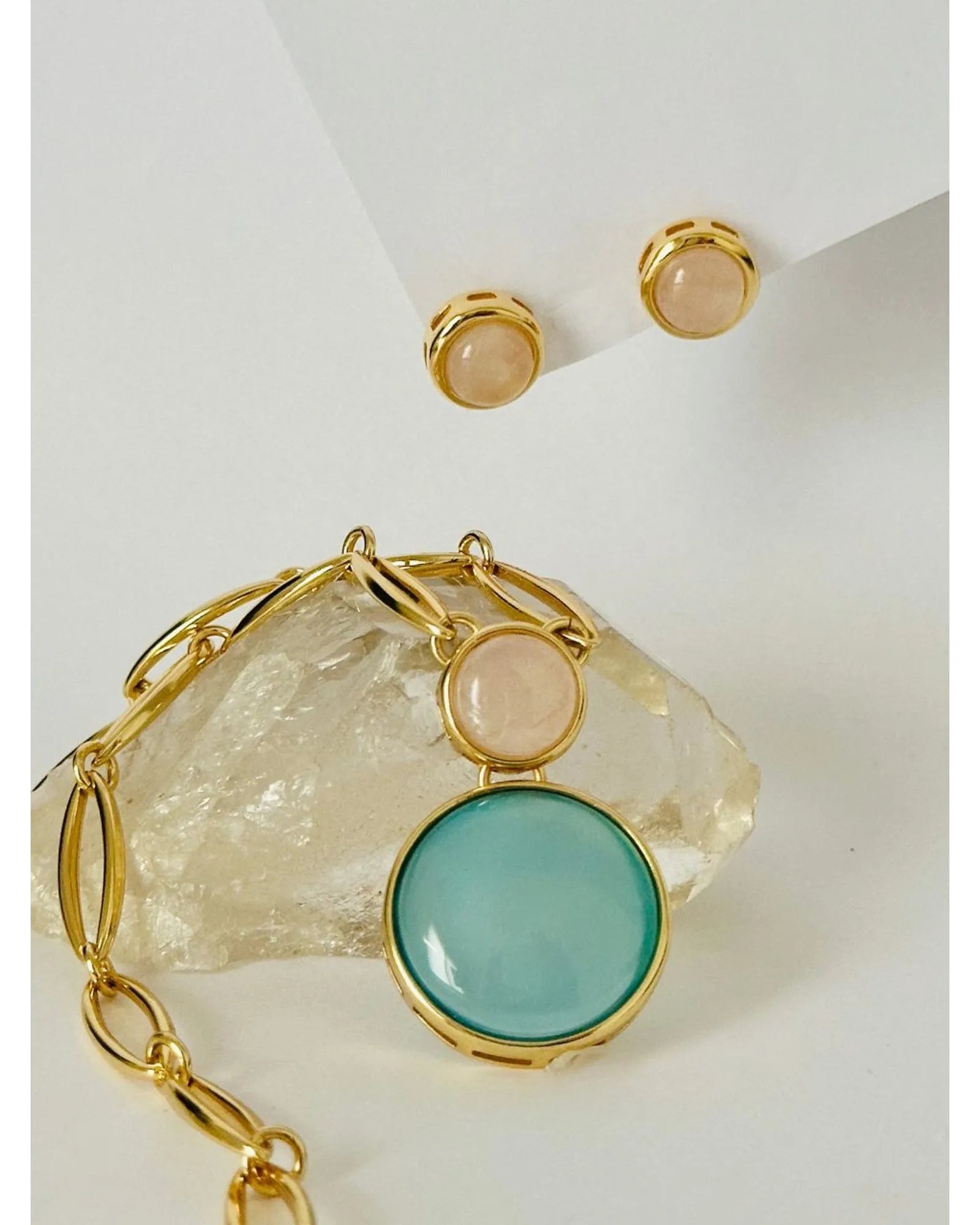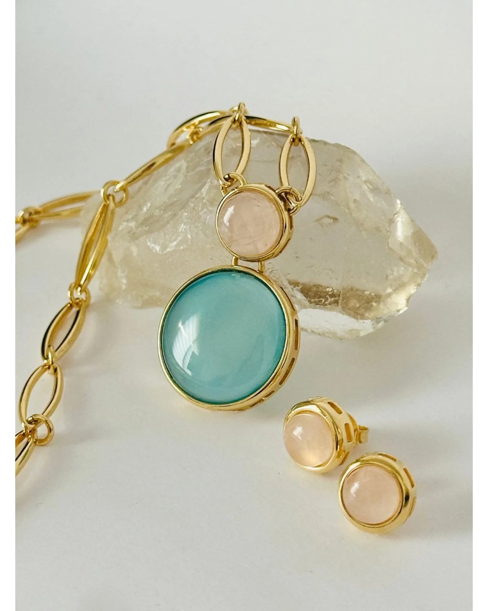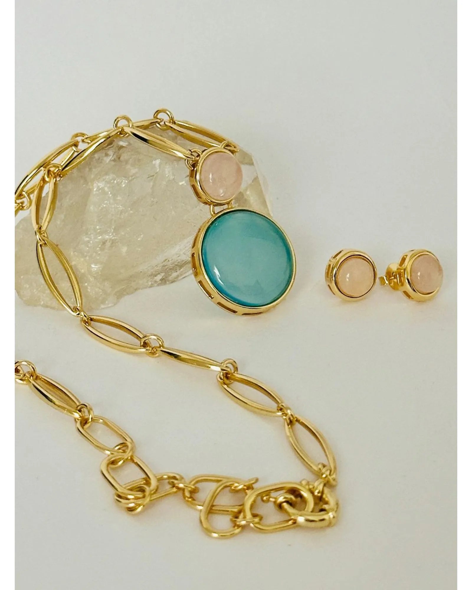 This stunning 18K gold-plated set blends the boldness of elongated gold links with the gentle energy of rose quartz — the stone of love and harmony! ✨ The necklace features two statement crystals that exude elegance, while the round earrings add a timeless and refined touch.