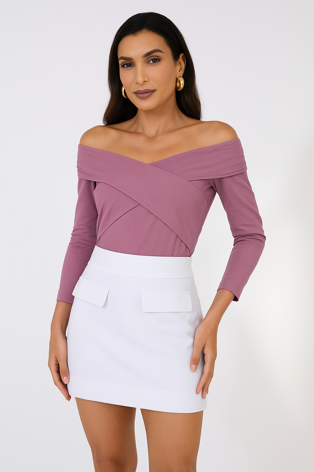 Blouse in viscose with stretch, featuring a front wrap design and long sleeves.