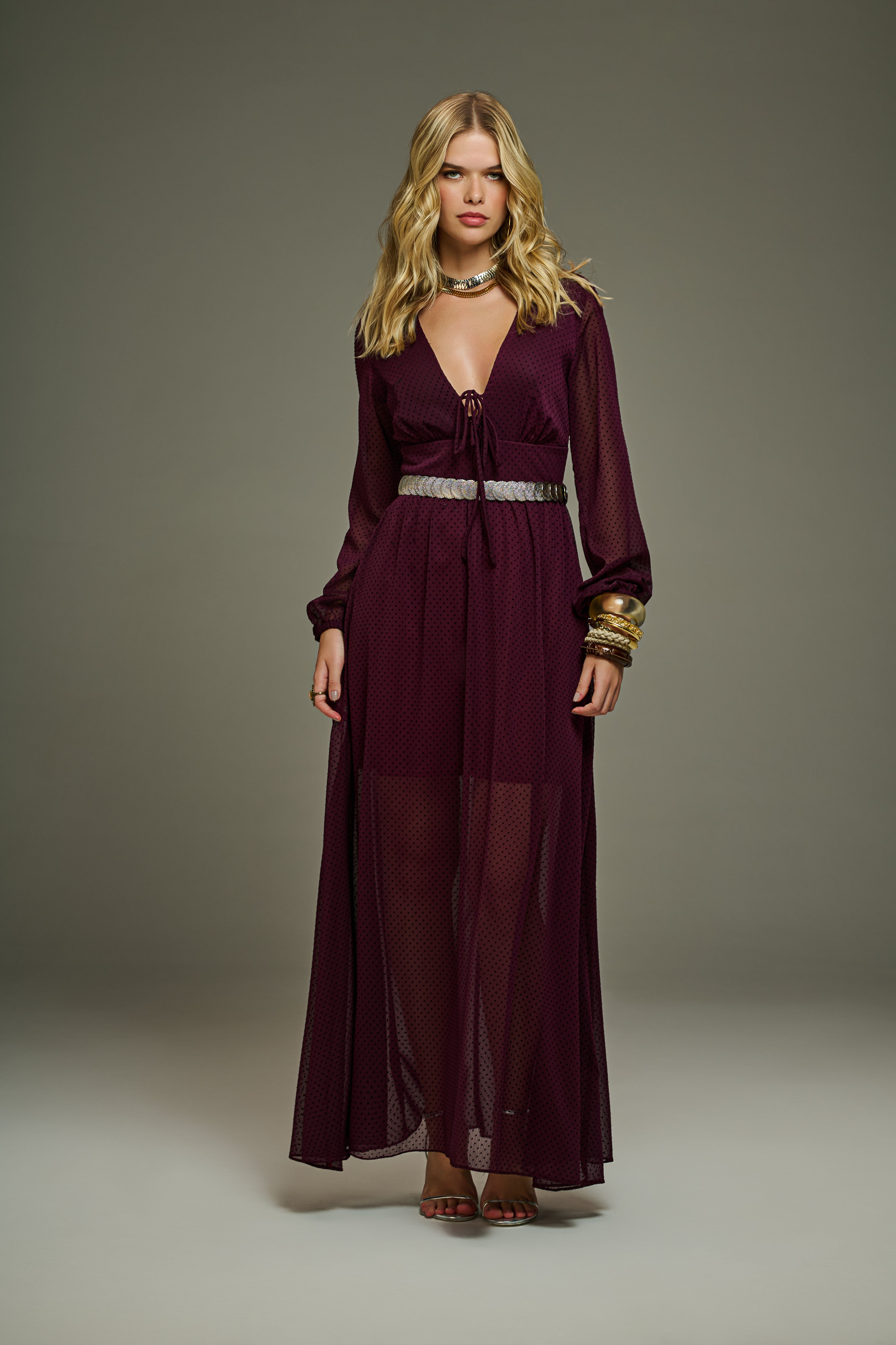 This long flowing dress is designed in a princess cut that flatters the silhouette with elegance and movement. Crafted in a rich burgundy tone with delicate black polka dots, it combines timeless charm with a modern touch. Perfect for both daytime events and evening occasions, this dress is fully fluid and effortlessly sophisticated.