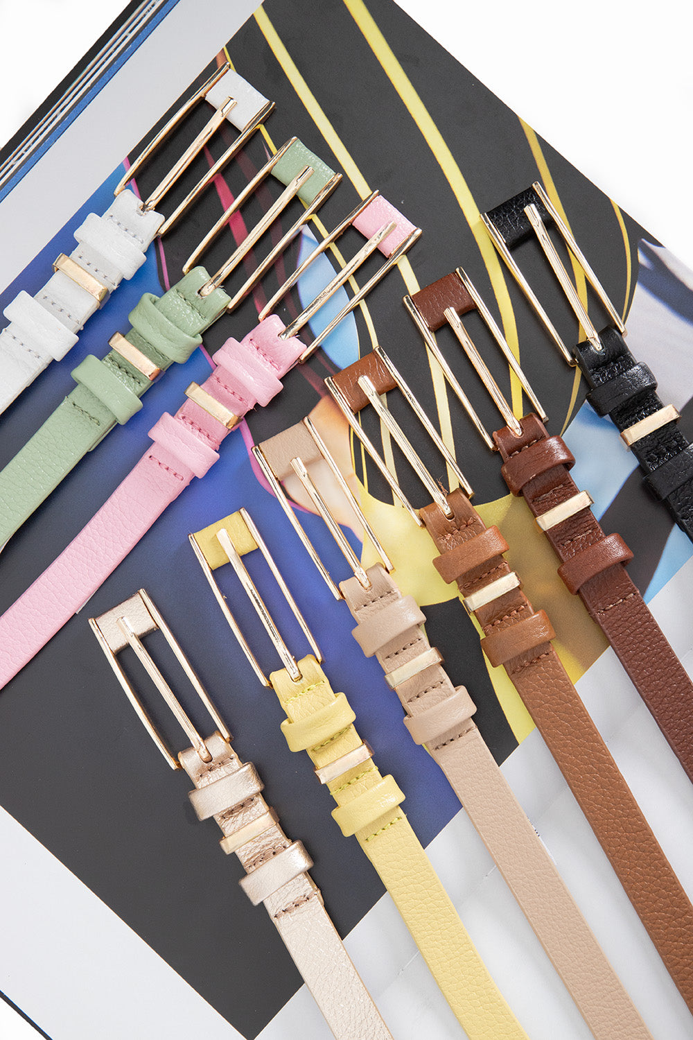 This elegant and versatile Brazilian belt is crafted from 100% genuine leather and features a slim silhouette with a polished gold-tone buckle and three classic-color keepers. A refined accessory designed to complement any outfit, from casual to sophisticated.