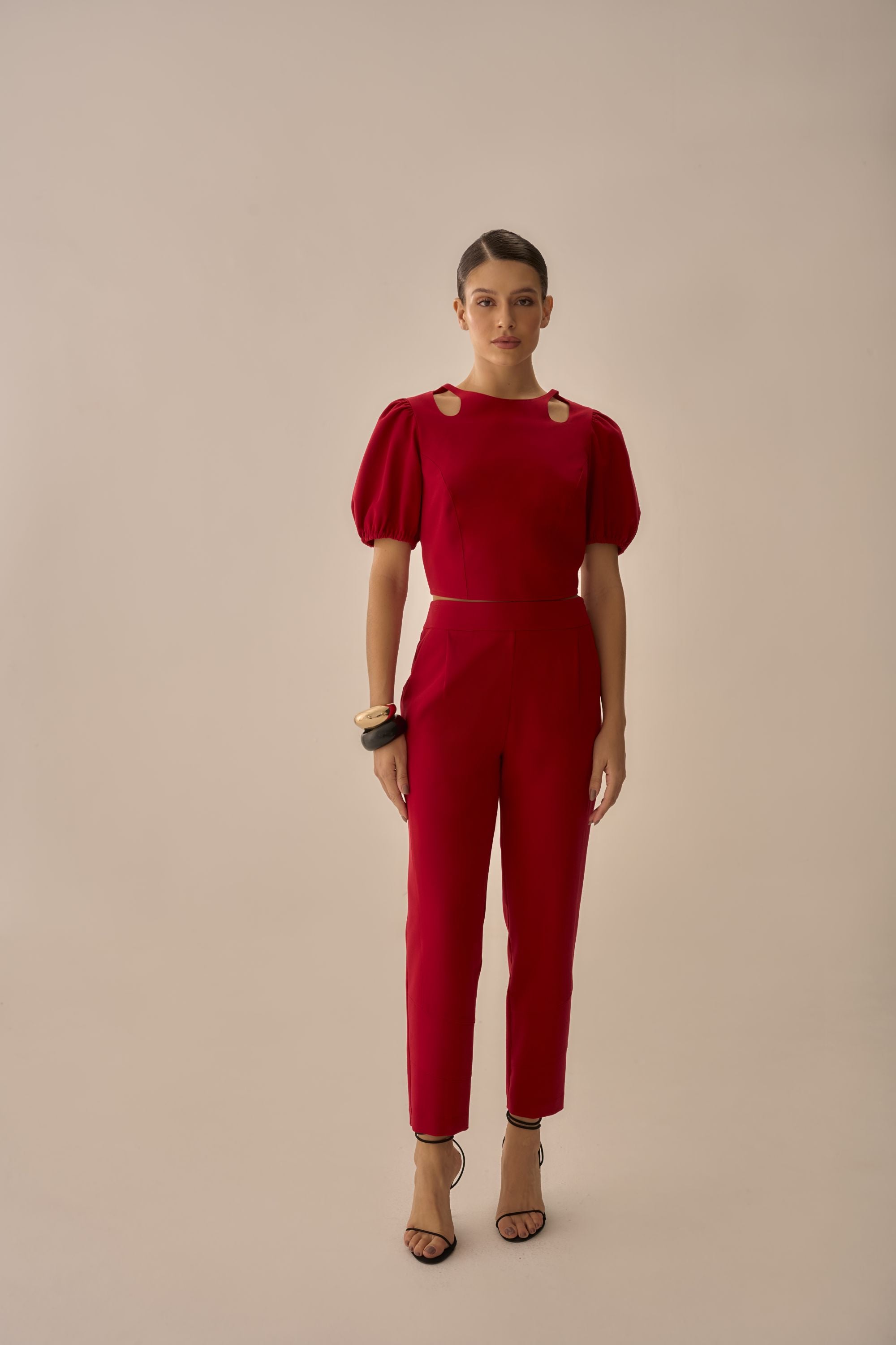 A modern and feminine set featuring a stylish top with shoulder cutouts and puff sleeves, adding a touch of boldness to its delicate design. The carrot-cut pants are enhanced with pleats and refined seam details, creating a polished and contemporary silhouette.