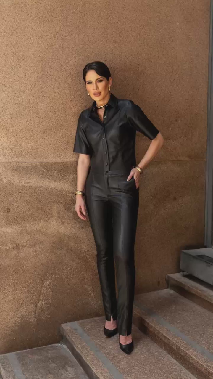 Modern and edgy, these women’s vegan leather pants feature a structured double waistband and asymmetric flap pockets for a unique design. Crafted for both style and comfort, they bring a bold twist to classic tailoring. Perfect to pair with blouses, knits, or blazers for chic day-to-night looks.
