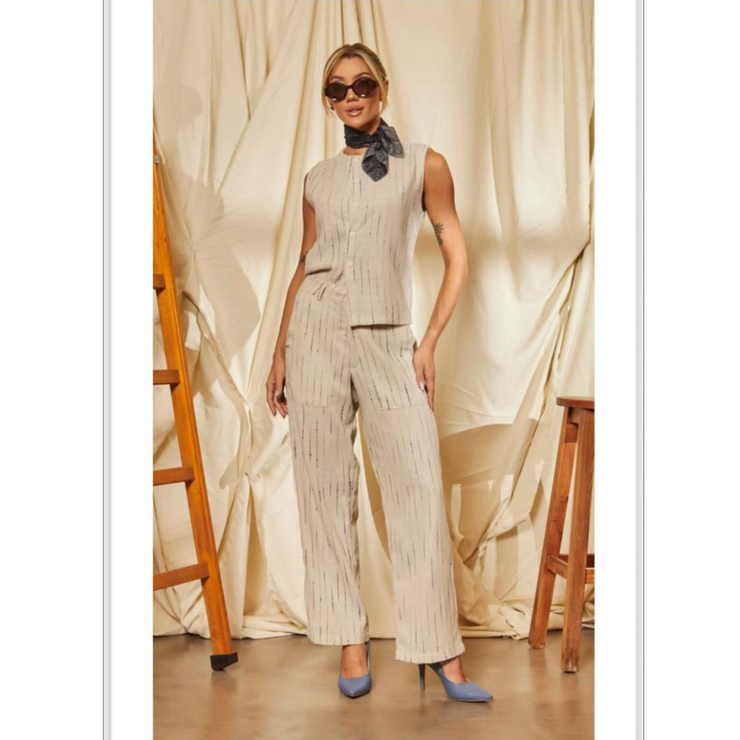 This stylish set in viscolinho includes wide-leg pants and a matching top, both featuring delicate blue stitching for a unique touch. The look is completed with a shirt designed with classic front buttons, combining comfort and elegance. Perfect for modern and versatile outfits, this viscolinho set transitions effortlessly from casual chic to refined occasions.