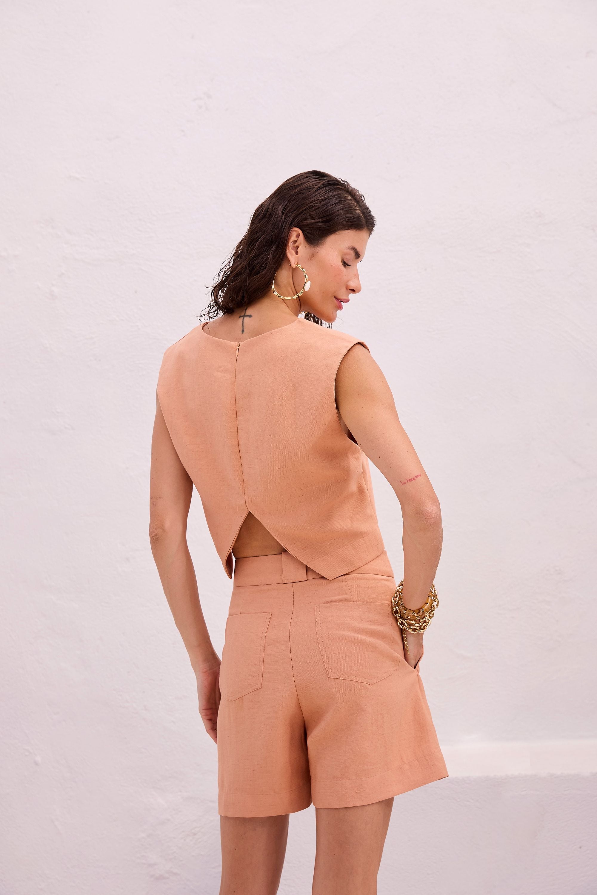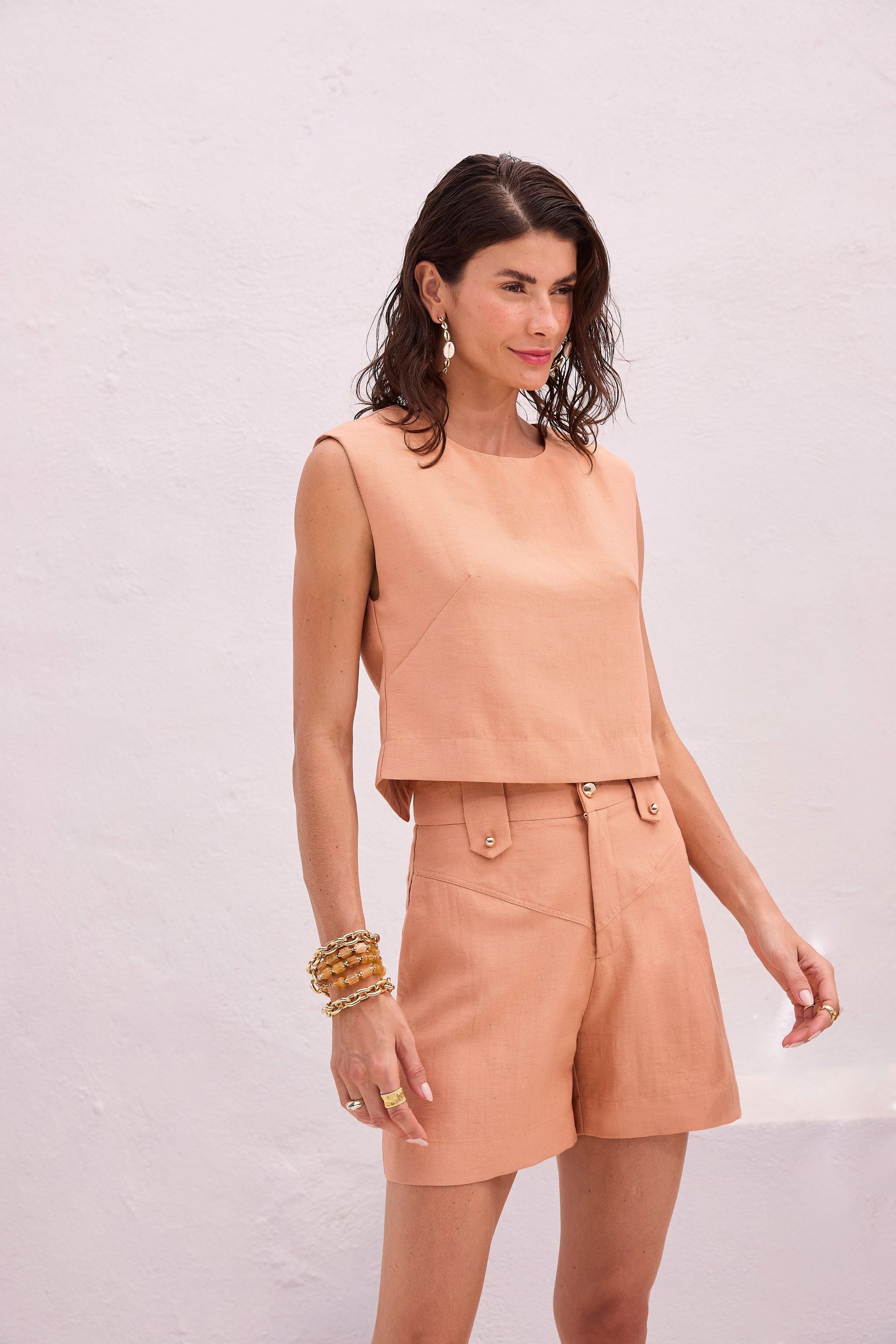 Embrace summer style with our elegant Viscolinho Shorts and Top Set, featuring unique cutouts and sophisticated design elements. The ensemble is enhanced with decorative buttons and golden finishes, adding a touch of luxury to this chic outfit. Perfect for casual outings or special occasions, this set showcases comfort without compromising on style.